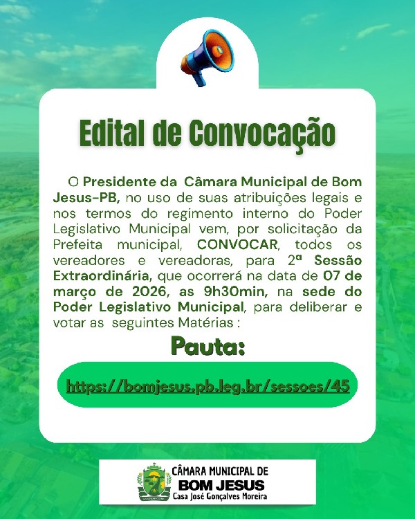 CONVOCAR todos os Senhores e Senhoras. Vereadores. ANA KARLA SILVA GONÇALVES DIAS DE SOUZA, EDSON DARLEY DE SOUSA NASCIMENTO, LARISSA GONÇALVES RICARTE, FÁBIO ABEL MANGUEIRA, EVANDRO DOS SANTOS SOUZA, GIVALDO GONÇALVES DA SILVA SOBRINHO, MARIA DAS GRAÇAS LOPES DE SOUZA, TOMAZ DUARTE NETO E TITO LIBIO DIAS, para a 2ª Sessão Extraordinária a realizar-se no dia 07 DE MARÇO DE 2026 às 09h30min. na Sala de Sessões desta Casa, com a seguinte ordem do dia: